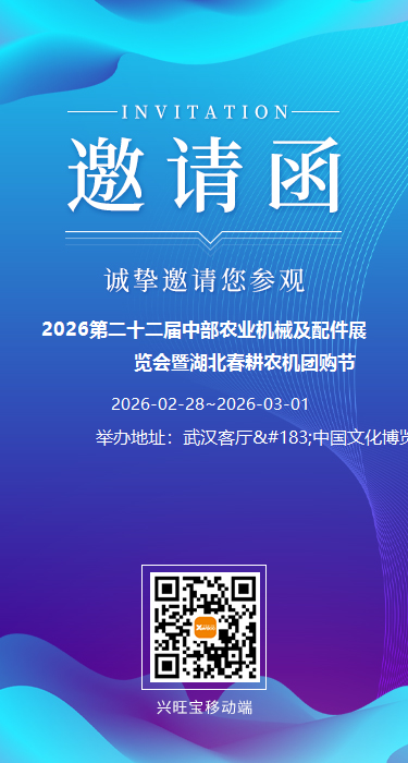 为深入贯彻落实《中共中央 国务院关于进一步深化农村改革扎实推进乡村全面振兴的意见》全面实施农业农村部“智慧农业行动计划”,推动农机装备高质量发展,加快先进适用农机研发应用,老旧农机报废更新,发展智慧农业,拓展人工智能技术应用场景。以科技创新引领先进生产要素集聚,发展农业新质生产力。2026第二十二届中部农业机械及配件展览会暨湖北春耕农机团购节定于2026年2月28日-3月2日在武汉客厅·中国文化博览中心举办。现将有关事宜通知如下: