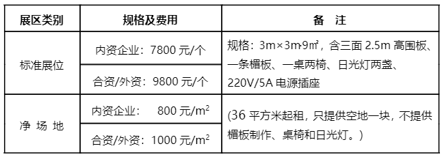 最小标准展位9㎡,最小净地展位36㎡,不受理小于9㎡的标准展位。内资企业若展出境内生产合资品牌产品或境内生产国外品牌产品,均按合资/外资标准收费。